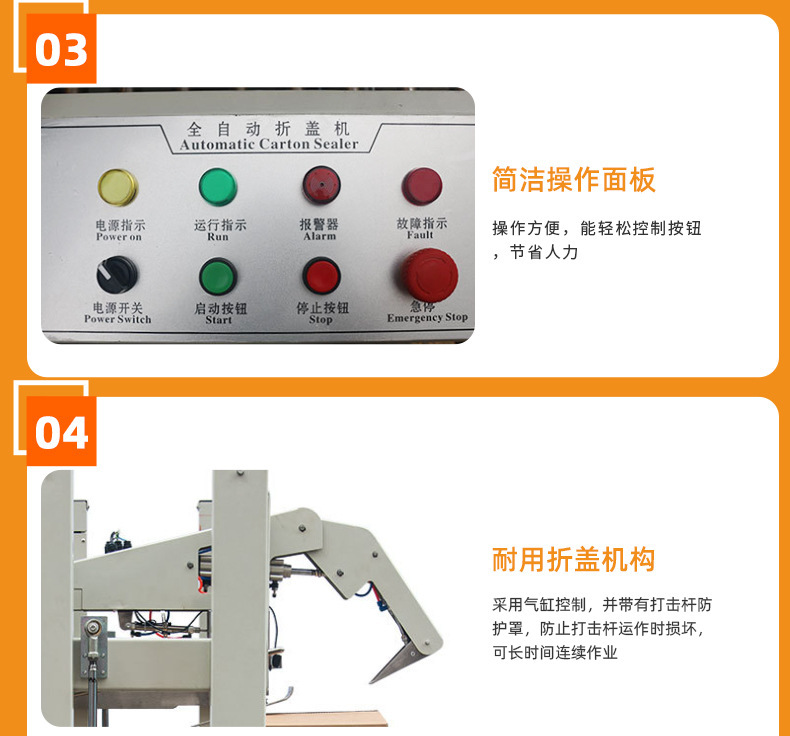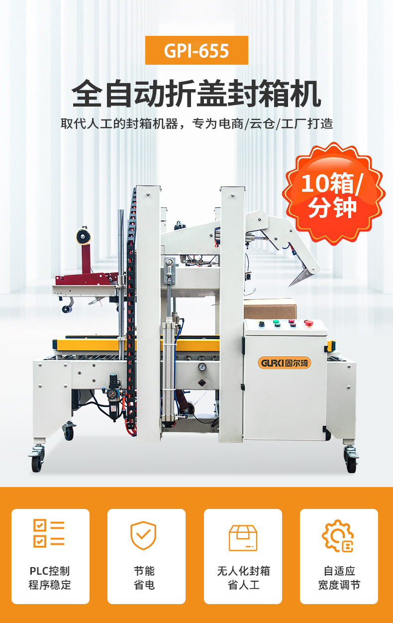 全自動(dòng)折蓋封箱機(jī)自動(dòng)折蓋封箱,封箱作業(yè)一氣呵成,可配合自動(dòng)化包裝機(jī)械系列使用。且能替代人工,提高生產(chǎn)效率,降低成本,可節(jié)省5-10%耗材。該款折蓋封箱機(jī)廣泛應(yīng)用于食品、醫(yī)藥、飲料、煙草、日化、汽車、線纜、電子行業(yè)。