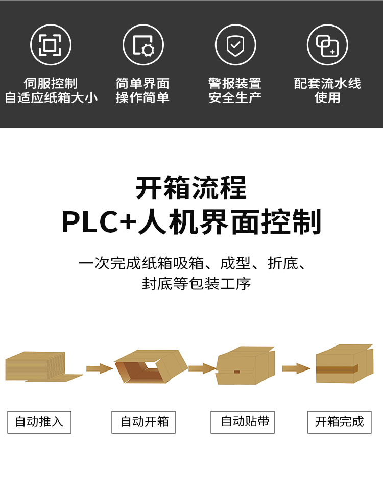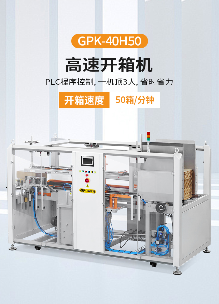 高速開箱機(jī)GPK-40H50是本公司自主生產(chǎn)設(shè)計的產(chǎn)品,臥式開箱速度達(dá)到50箱/分鐘的高速開箱機(jī),高性價比配置,使用壽命長,經(jīng)濟(jì)實(shí)惠。 該款開箱機(jī)廣泛應(yīng)用于食品、醫(yī)藥、飲料、煙草、日化、電子等各行業(yè)。