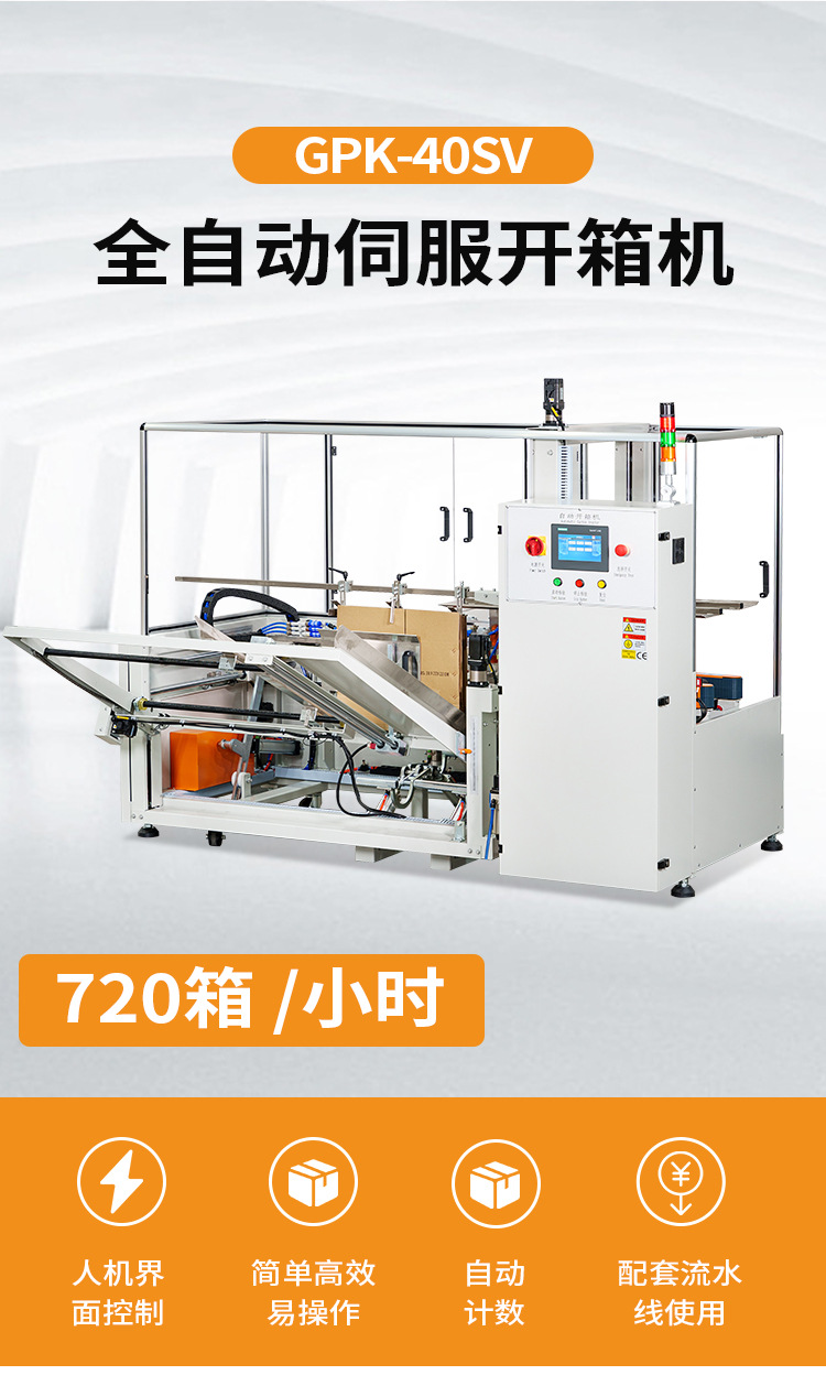 全自動伺服開箱機(jī)是一款支持多種規(guī)格開箱設(shè)備,設(shè)置立式料槽,儲料更多,大大節(jié)省了紙箱更換調(diào)節(jié)問題;整機(jī)采用電眼自動感應(yīng)、伺服控制和驅(qū)動設(shè)計,開箱速度更快更穩(wěn),加裝安全防護(hù)門,開門即可換膠帶,更方便,省心;同時,整機(jī)采用嚴(yán)格的生產(chǎn)工藝零部件和伺服驅(qū)動開箱,速度達(dá)12箱/分鐘,自動吸取紙箱并成型,并加裝了斷膠帶、無膠帶自動報警提示功能,該款開箱機(jī)已廣泛用于食品、醫(yī)藥、飲料、煙草、日化、電子等各行業(yè)。