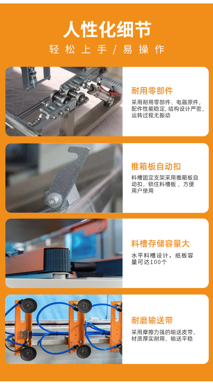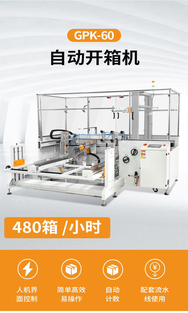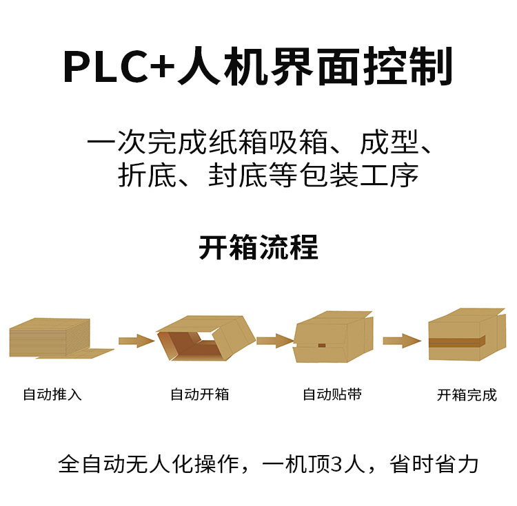 自動開箱機改變傳統(tǒng)料槽設計,采用耐用零部件、電器原件,配件性能穩(wěn)定,結(jié)構(gòu)設計嚴密,運轉(zhuǎn)過程無振動,用水平料槽設計,紙板容量可達100個,同時,加大開箱設計,可開紙箱長達80cm,封箱折底一次完成,廣泛用于食品、醫(yī)藥、飲料、煙草、日化、電子等各行業(yè)。