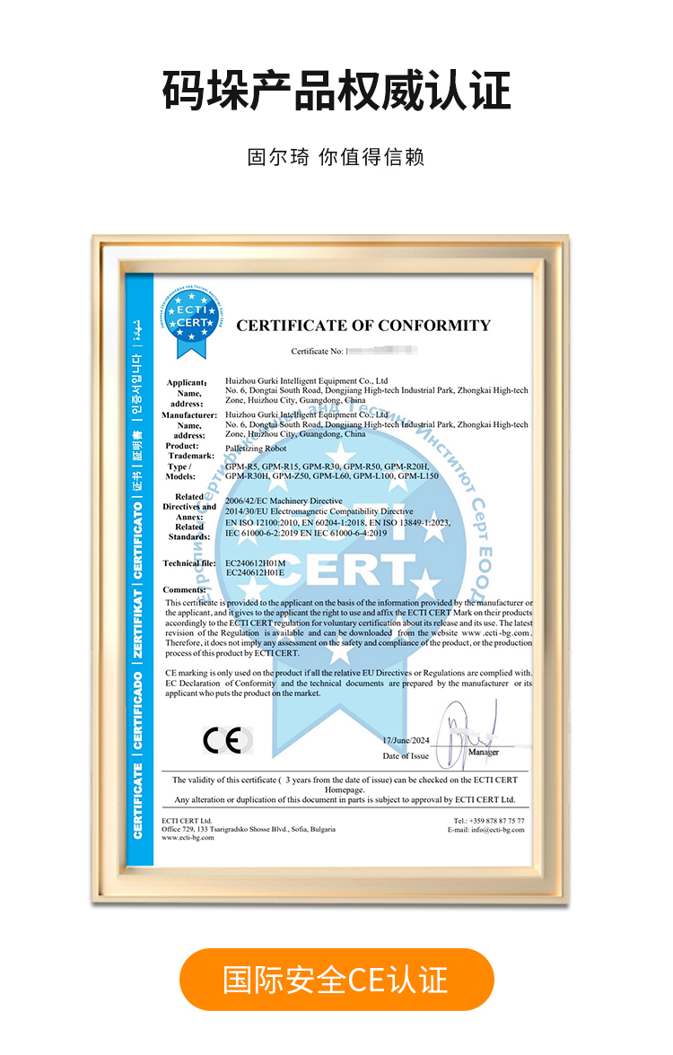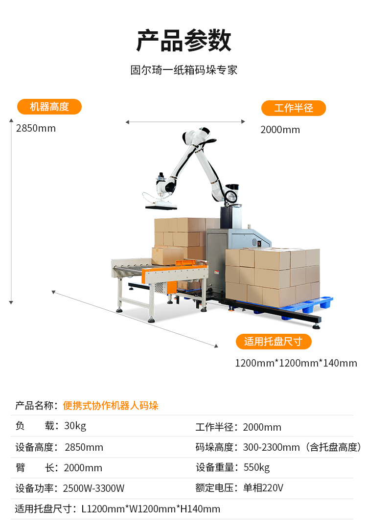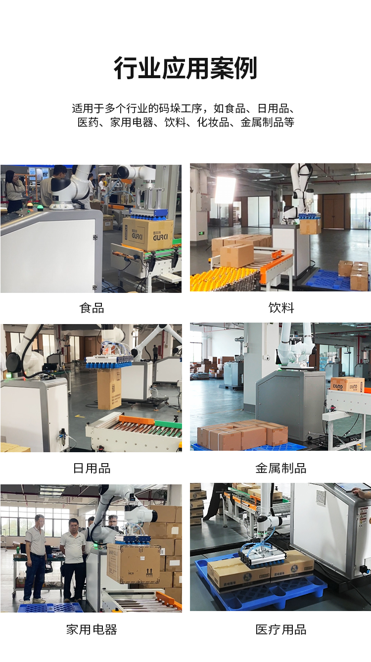 提供3年質?;蛘咦鳂I(yè)1000萬次的售后服務。協(xié)作機器人碼垛,與人類工作人員緊密合作,提高生產(chǎn)效率、靈活適應不同任務。安全配備傳感器,為工作人員創(chuàng)造更安全高效的工作環(huán)境,外形精巧美觀,調整方便簡單,本設備采用觸控屏操作,實現(xiàn)智能化操作管理,簡便、易掌握??纱蟠蟮販p少勞動人員和降低勞動強度。可獨立使用也可配套自動供棧機和棧板輸送機來實現(xiàn)全自動碼垛系統(tǒng),廣泛應用于多個行業(yè)的碼垛工序,如紙箱類、醫(yī)藥類、日用品、食品、飲料、化妝品、金屬制品等。