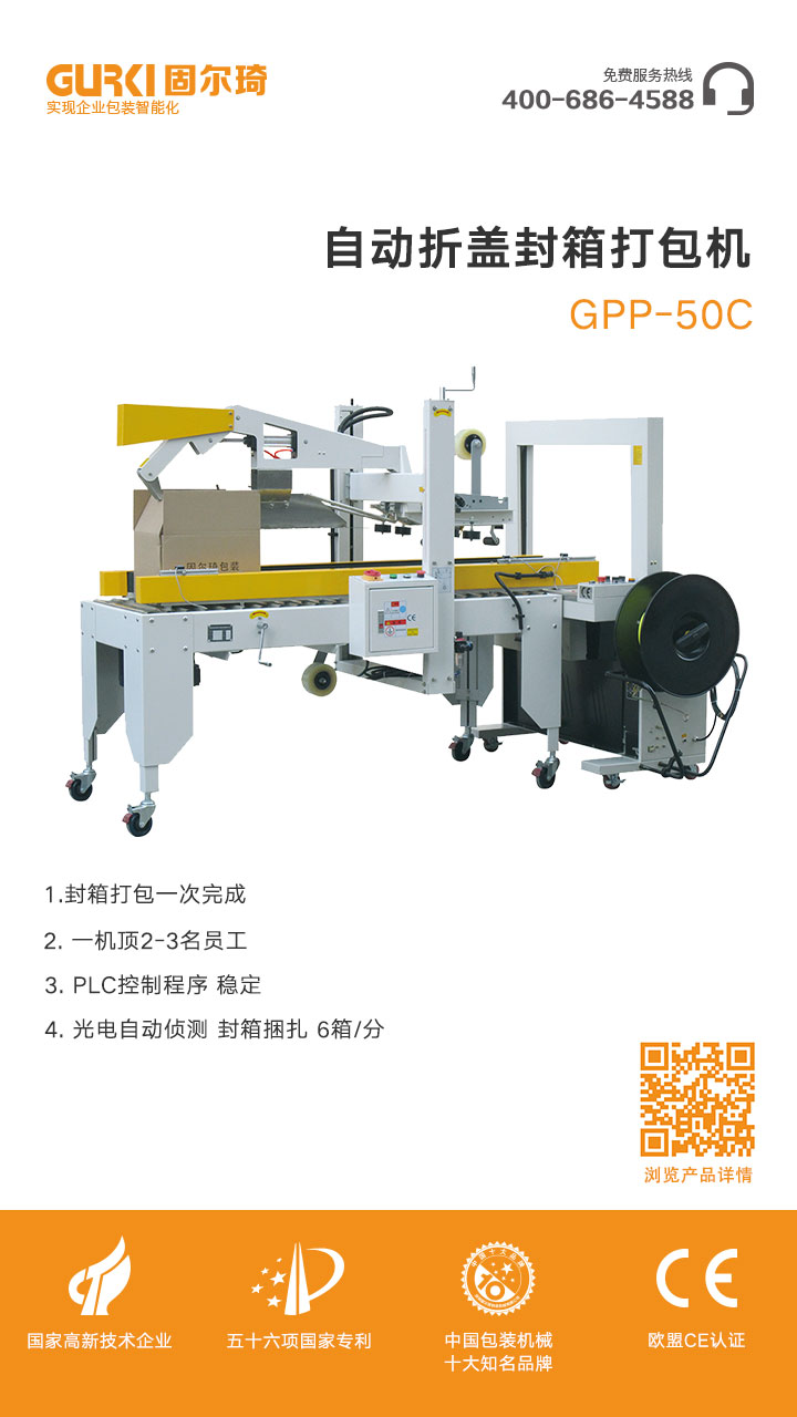 自動封箱打包機GPP-50C+GEQ-200H的配套,是一種集自動封箱及捆扎為一體的包裝 機,可配套自動化包裝流水線使用,自動折蓋、上下封膠帶、多道捆扎, 實現(xiàn)后道無人化包裝,工作效率高,快速,平整,美觀工作效率,高更好 滿足新老顧客的需求。廣泛適應(yīng)于印刷、彩繪、賀卡、相 冊、相框、醫(yī)藥、電子、日化、化妝品等大批量生產(chǎn)的行業(yè)。