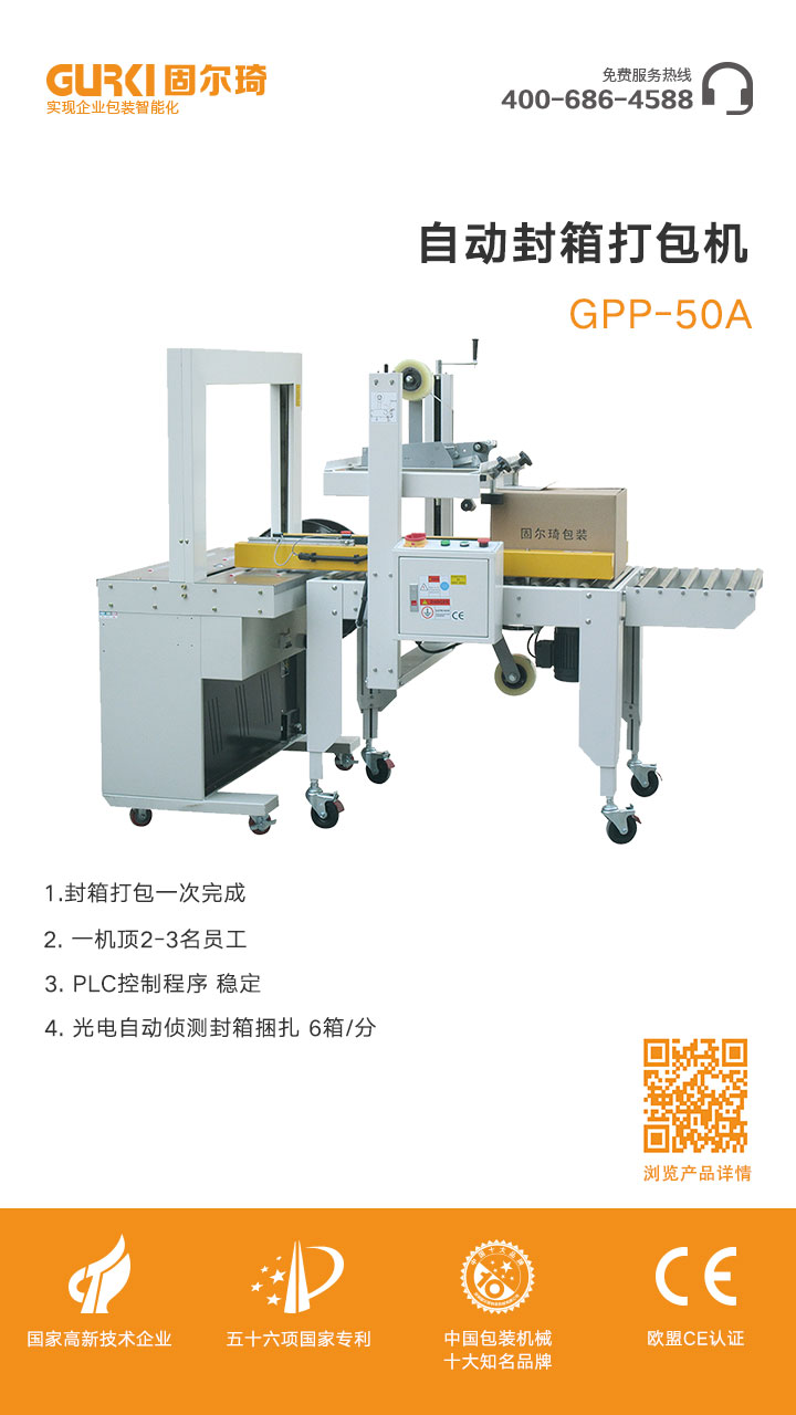 自動封箱打包機GPP-50A的配套,使全自動打包機和自動封箱機為一體的包裝機,可配套自動化包裝流水線使用,自動上下封膠帶,多道困扎,實 現(xiàn)后道無人化包裝;工作效率高,更好滿足新老顧客的需求。廣泛適應(yīng)于印刷、彩繪、賀卡、相冊、相框、醫(yī)藥、電子、日化、 化妝品等大批量生產(chǎn)的行業(yè)。